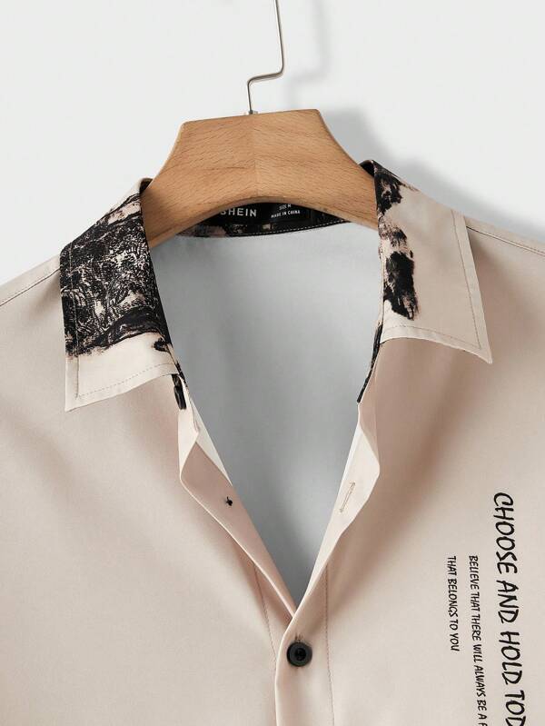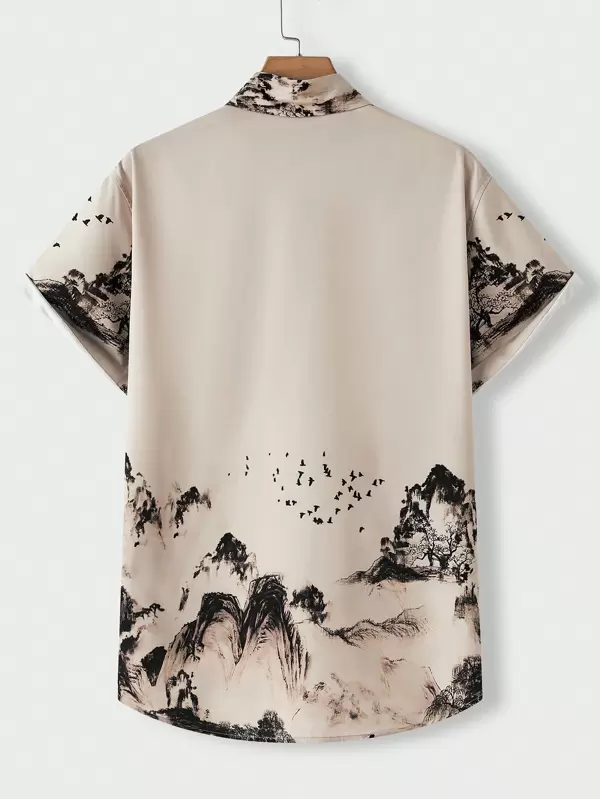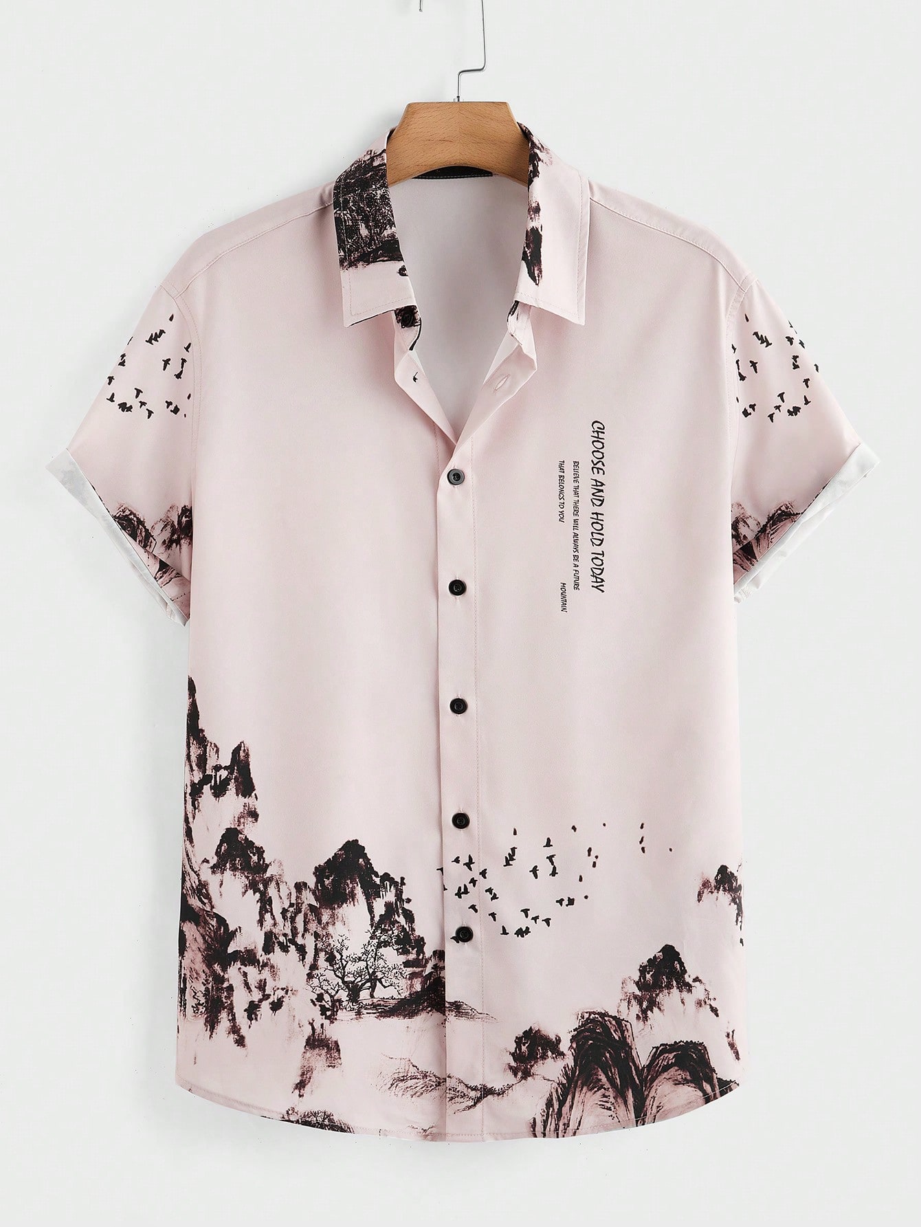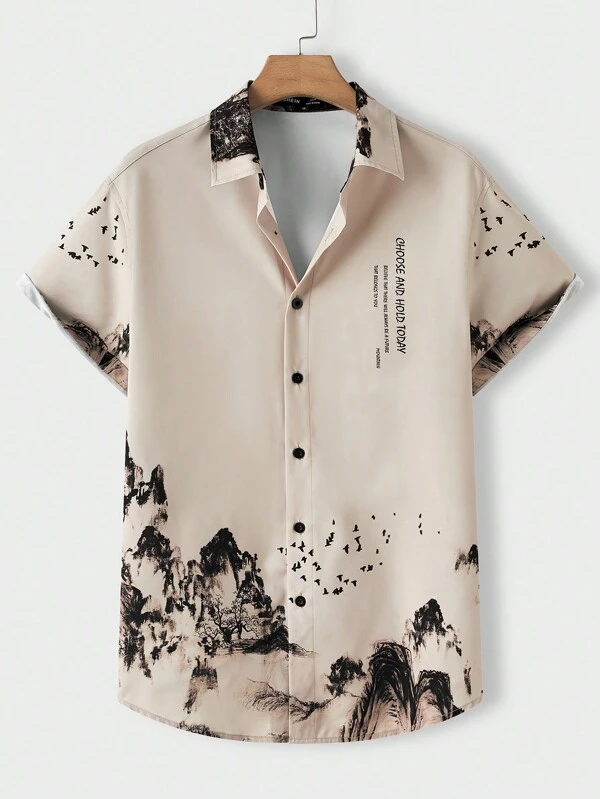 Chemise à manches courtes à boutons Manfinity ModaGents pour homme – Coupe ample avec imprimé paysage de montagne et d’eau et slogan – Convient pour un usage quotidien