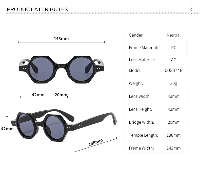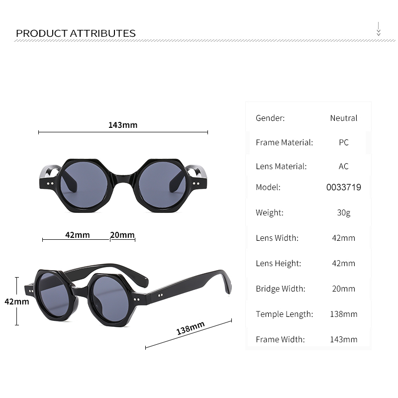 Les “Lunettes de soleil polygonales rétro pour hommes et femmes” sont des lunettes de soleil au design rétro, unisexe, et à la mode, parfaites pour les vacances, les activités en plein air, ou les shootings de rue. Leur petite monture polygonale leur donne un look distinctif et géométrique, apportant une touche avant-gardiste et originale à l’ensemble.